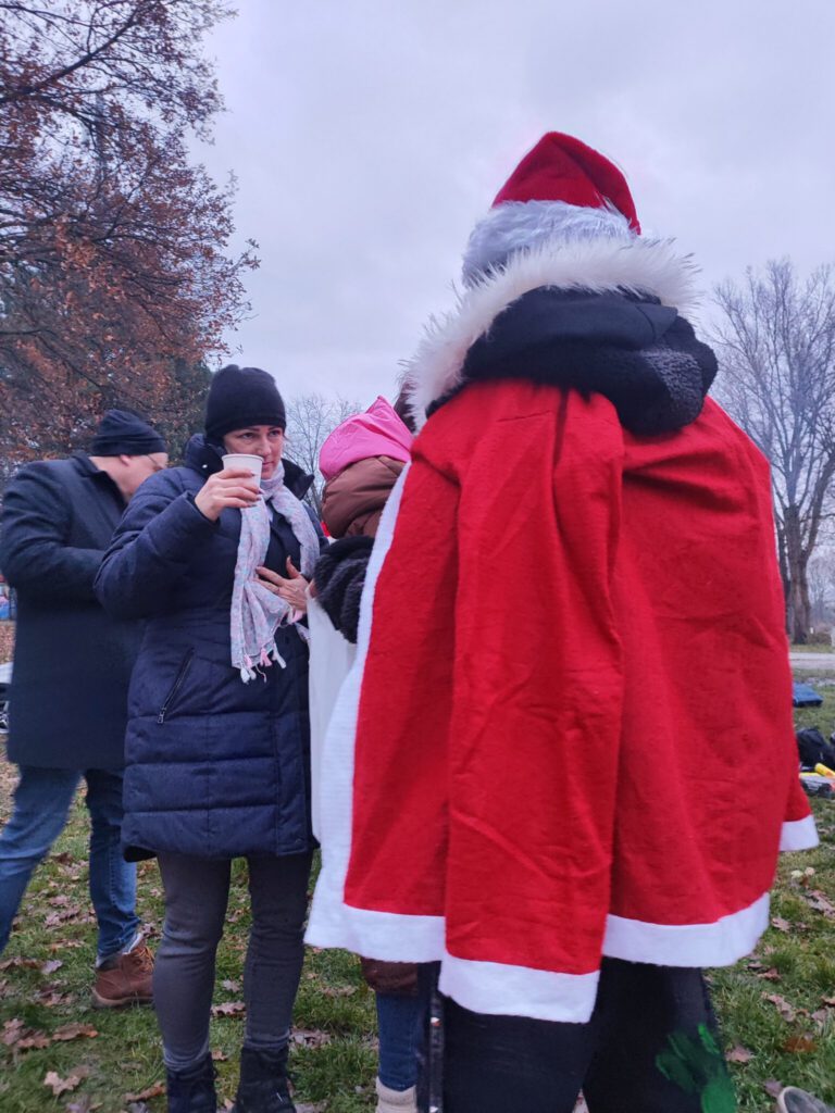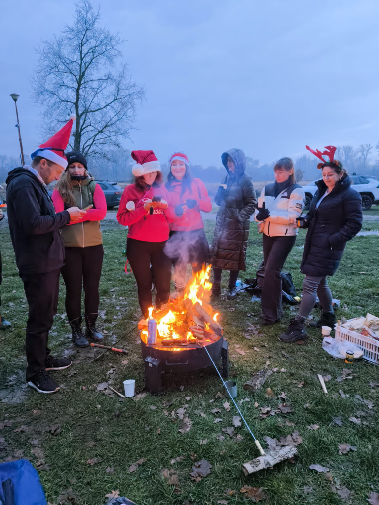 Po powrocie było ognisko i grill, gdzie można było się ogrzać, upiec kiełbaski i spróbować piernikowych słodkości. Dużym hitem okazał się także niealkoholowy grzaniec z pomarańczami, idealny na chłodny grudzień. W trakcie pikniku pojawił się też Mikołaj z workiem prezentów niespodzianek, co wywołało sporo uśmiechów.