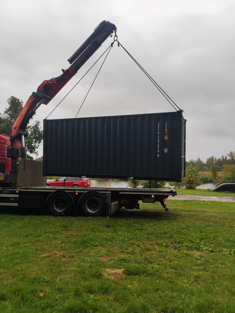 Na zdjęciach widać moment ustawienia kontenera, na którym opiera się cała przyszła infrastruktura. Najpierw wyznaczyliśmy poziomy i przygotowaliśmy punktowe fundamenty z bloczków. Potem ciężarówka z HDS-em ustawiła kontener dokładnie na przygotowanym podłożu.